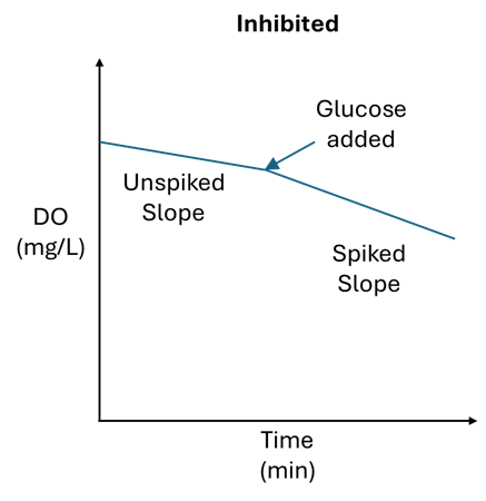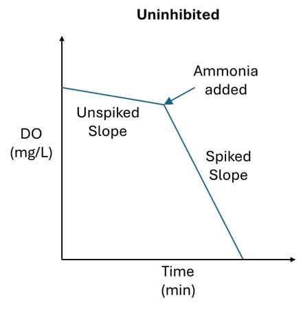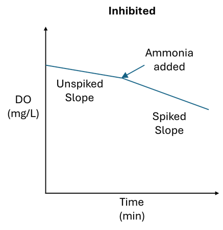 To determine if nitrifying organisms are inhibited, the same method can be applied as above, but instead of spiking with glucose, spike the sample with 0.1mL of household ammonia. Household ammonia has a concentration between 5-10% and should elevate the ammonia concentration in the BOD bottle to between 16 and 33 mg/L. If the oxygen uptake rate changes significantly, then the nitrifiers are likely not inhibited. If the rate does not change significantly, then the nitrifiers are inhibited and could be headed towards toxicity.