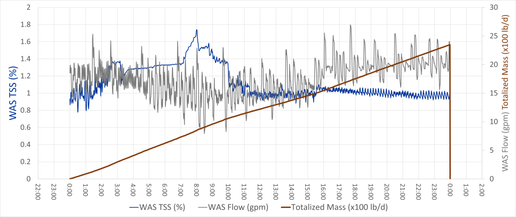 Here’s an example, based on the WAS data that was shown previously. Not only did this facility have variable WAS TSS concentration, but due to the design of the plant they also had inconsistent WAS flow. With all that variability, operators struggled to accurately calculate the pounds of solids wasted and therefore struggled to control SRT accurately. Totalizing the WAS completely removed the variability and now the operators know exactly how many pounds of solids were wasted that day: 2357.5 lbs.