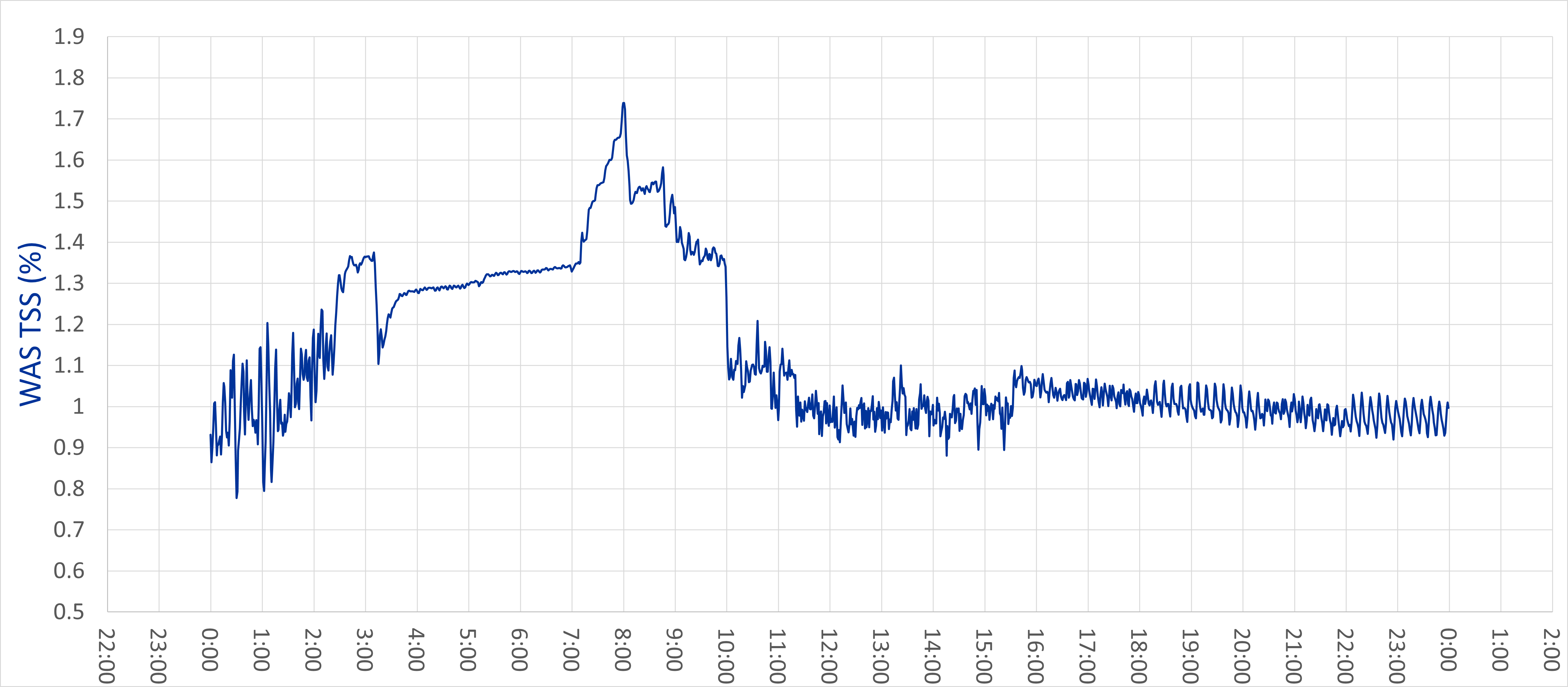 Grab samples are an instantaneous picture of the process – they are a “snapshot” of current conditions. If the process changes after the sample was collected, there is no way of knowing unless another sample is pulled. For example, the chart below shows WAS concentrations measured continuously over 24 hours by an online suspended solids probe – note the difference from 7 to 8am. At 7:00 the concentration is 1.33%, at 8:00 it’s 1.74% – 31% higher! How would that change wasting?