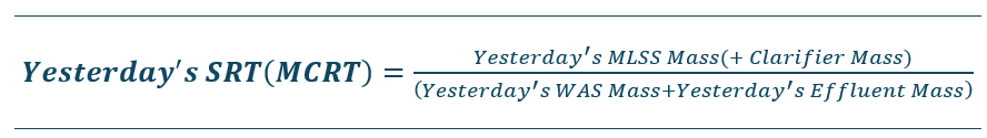 To calculate yesterday’s SRT(MCRT), the program should divide yesterday’s MLSS (+ Clarifier) mass by the pounds wasted from the totalized WAS plus the effluent pounds.